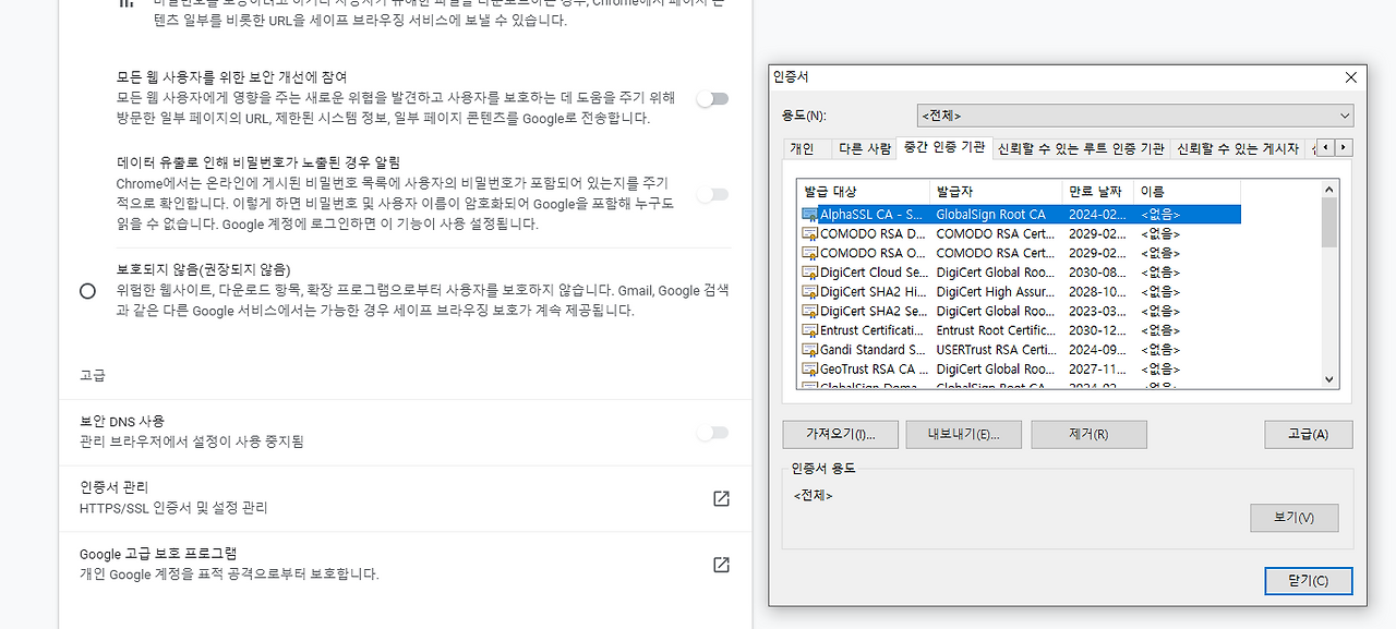 크롬 설정 → 개인정보 및 보안 → 인증서 관리